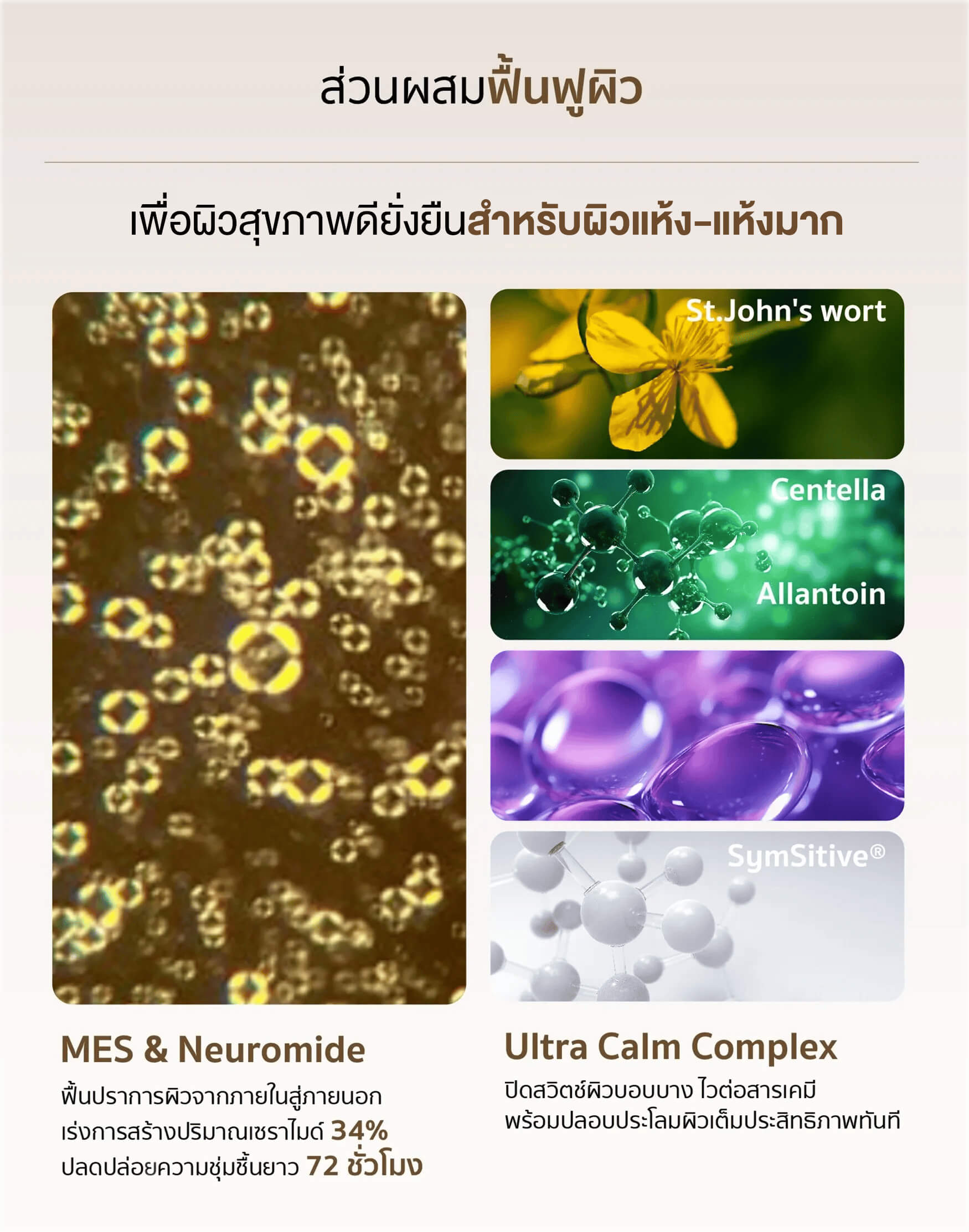 - นวัตกรรม CRYSTAL LAMELLA MES: ระบบแคปซูลหลายชั้นที่บรรจุ NEUROMIDE , Ceramide NP, Fatty acid, Cholesterol ซึ่งเป็นสารที่ช่วยฟื้นฟูชั้นเกราะป้องกันผิวและออกฤทธิ์ยาวนาน