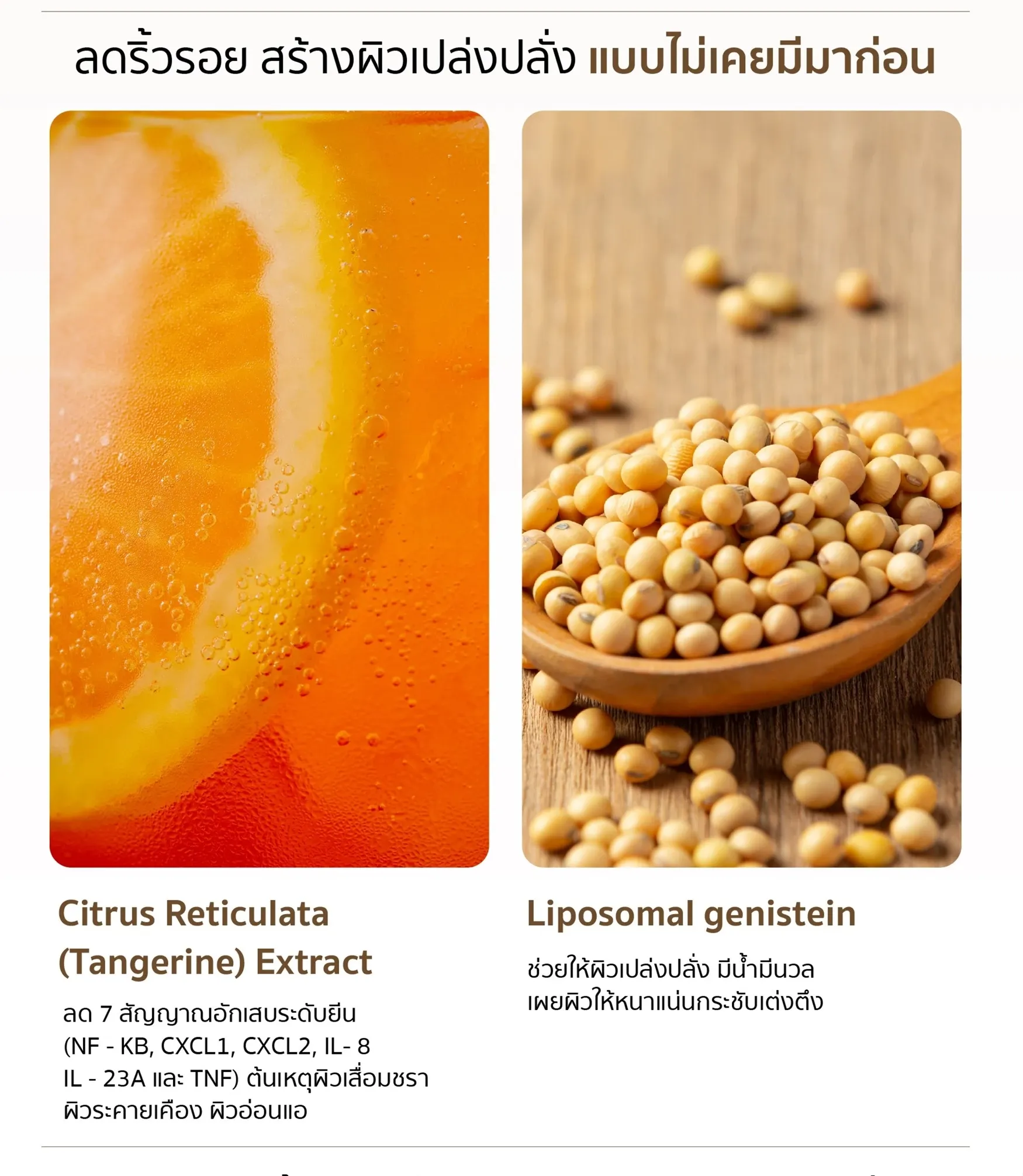- มีส่วนผสม Liposome Genistein ที่ช่วยให้ผิวเปล่งปลั่งนุ่มเนียน ลดเลือนริ้วรอย