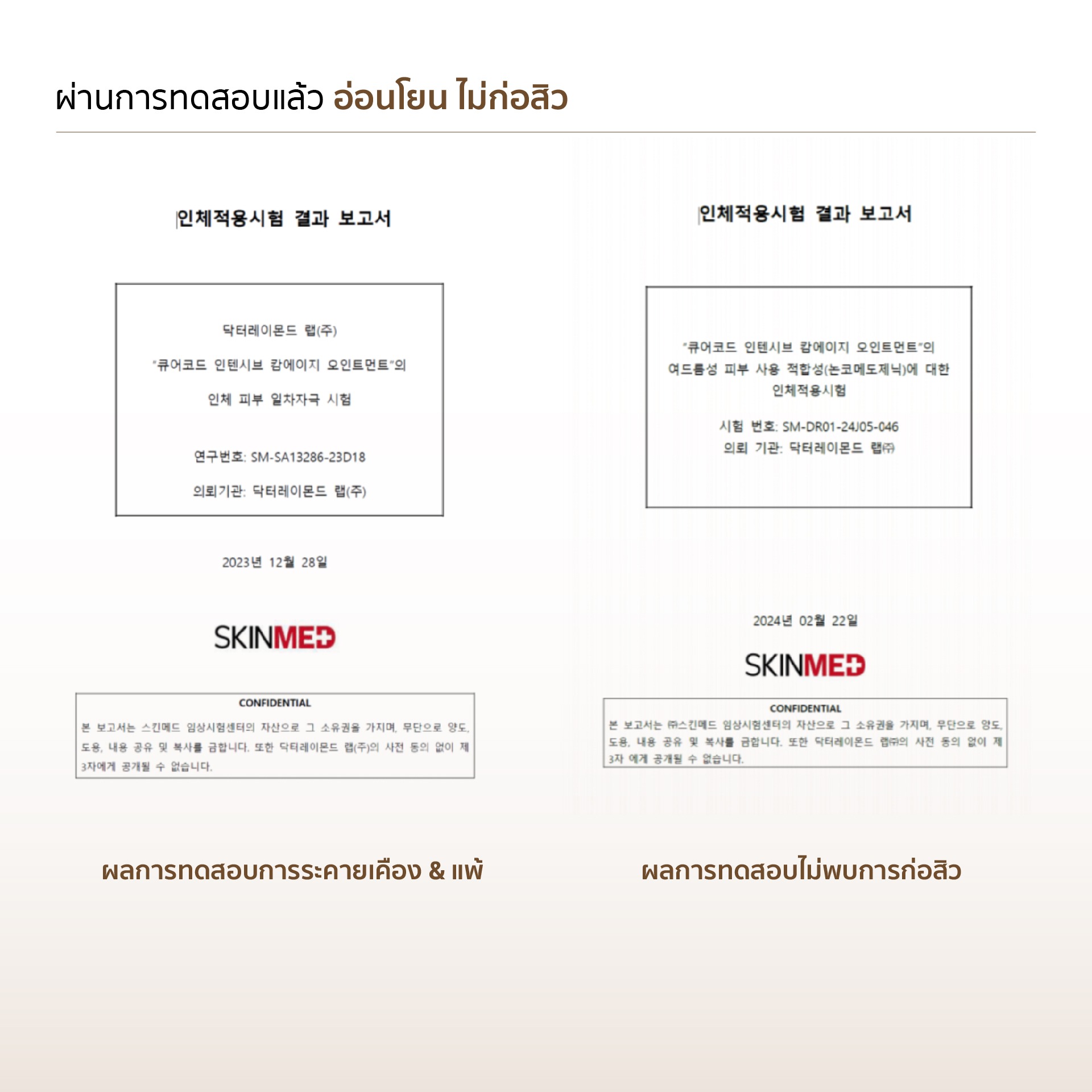 - Patch Test (ทดสอบการระคายเคืองแพ้) = ไม่พบสัญญานบ่งบอกอาการระคายเคืองแพ้