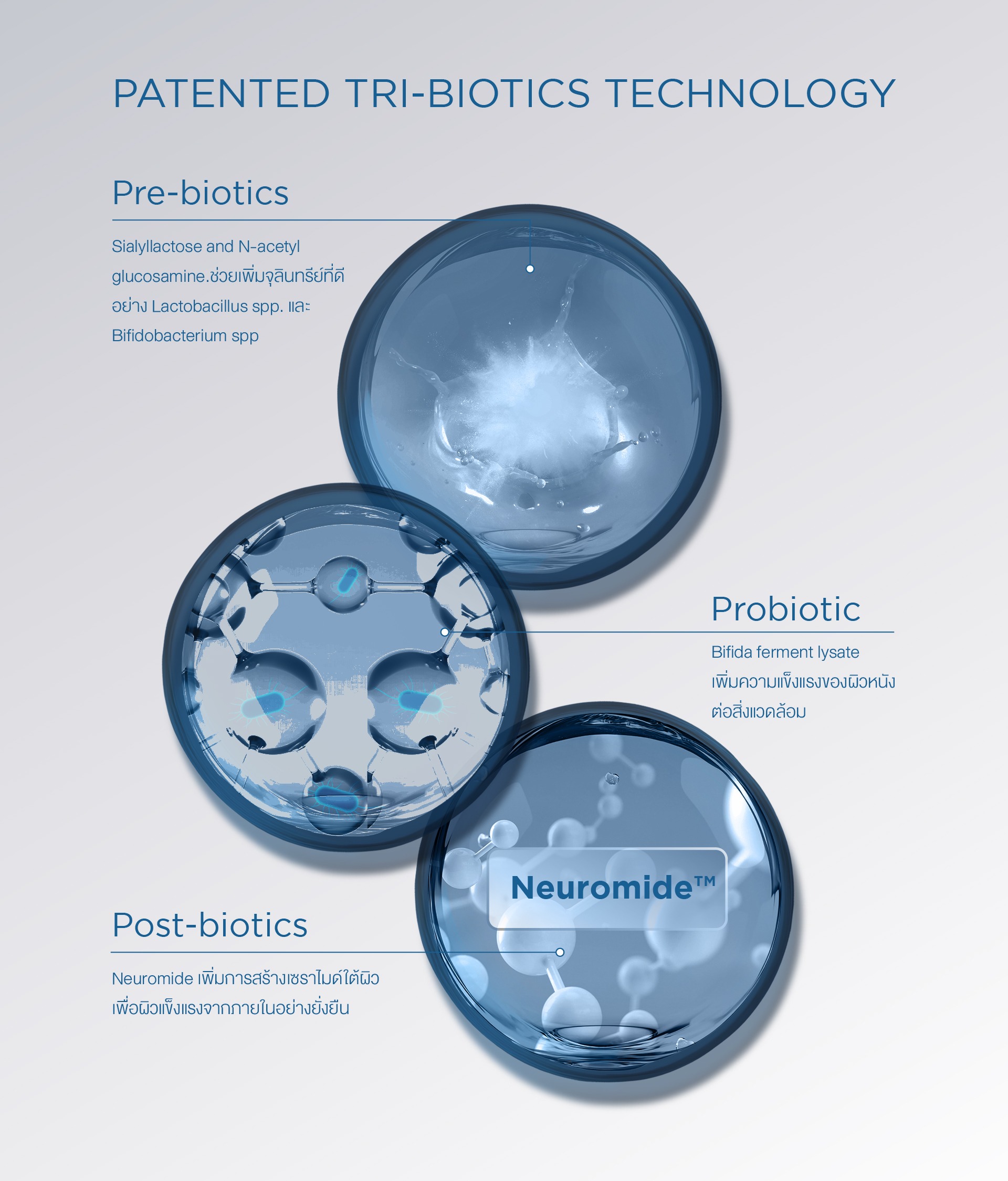 3 พลัง Tri-biotics เพื่อเสริมสร้างสมดุลไมโครไบโอมของผิว เพื่อดูแลผิว 5 ประการ